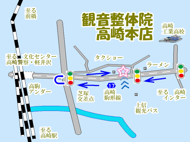 高崎線高崎駅東口を出て左折、東三条通りを北へ、信号6基を経て、芝塚交差点を右折、高崎駒形線を高崎インター方面200メートル信号手前です